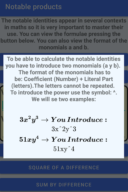 The application shows the develpment of the notable identities, doing the operations step by step. The user can also see the formulae of the notable identities.