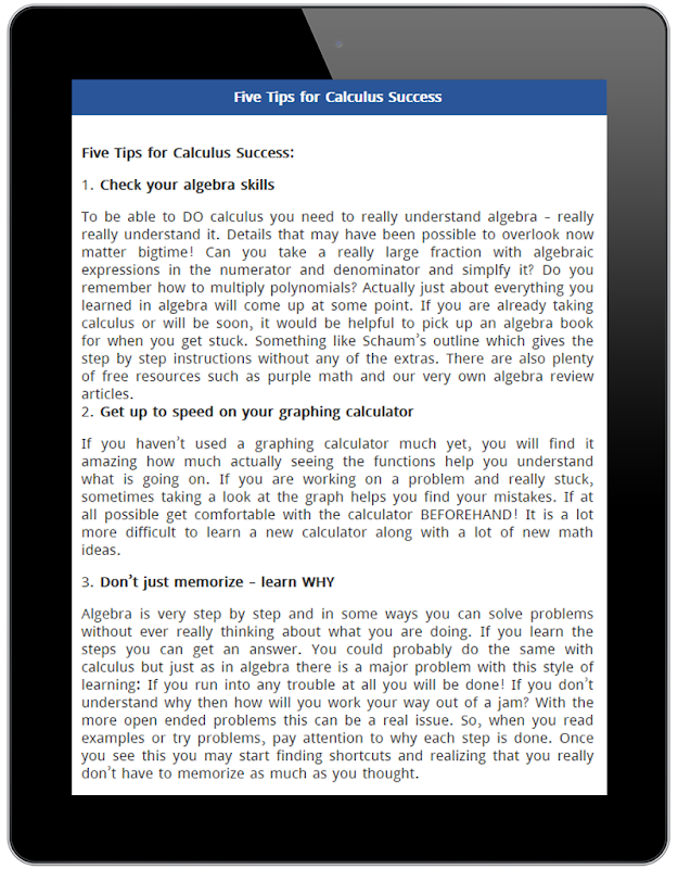 微积分提示和技巧集合。最适合考试准备的应用。微积分涉及“连续变化”的研究,以及它们在求解方程中的应用。它有两个主要分支: