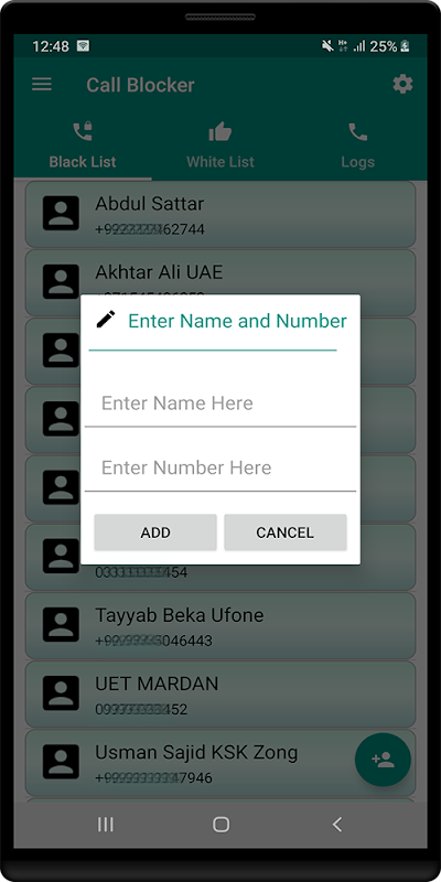 添加联系人、日志中的号码,还可以手动将您想要添加到黑名单的姓名和号码。