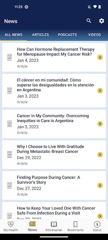 - A new Bookmarks section: Save cancer types, articles, podcasts and videos from the News and Information sections of the app for later reference.