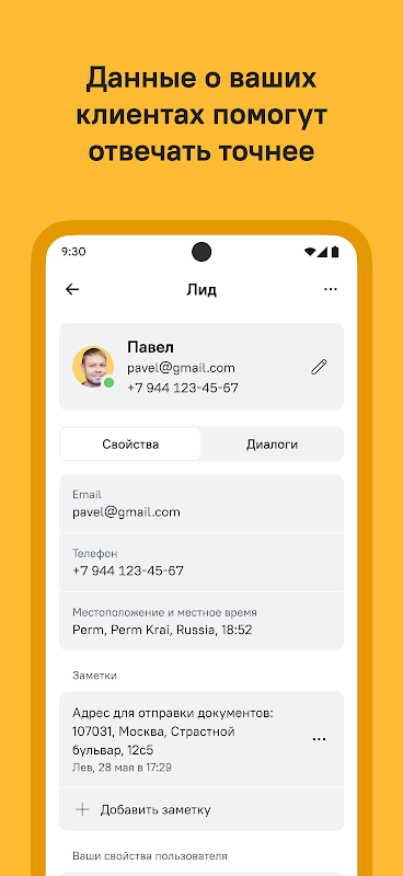 来自网站聊天、社交网络和即时通讯工具的所有用户请求现在都在您的智能手机中。按操作员、标签和状态过滤对话框。