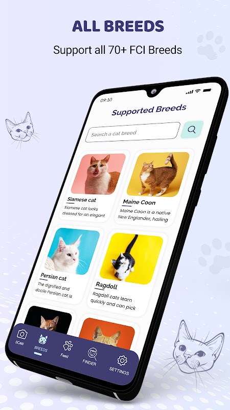 不确定哪种猫品种适合您?没问题!只需回答几个关于您的生活方式、生活状况和偏好的问题,Cat Finder 功能就会推荐最符合您需求的猫品种。 Cat Identifier 拥有一个包含 70 多种猫品种的综合数据库,其中包含有关每个品种的个性、能量水平、大小和修饰要求的详细信息。此信息将帮助您做出适合您的品种的明智决定。