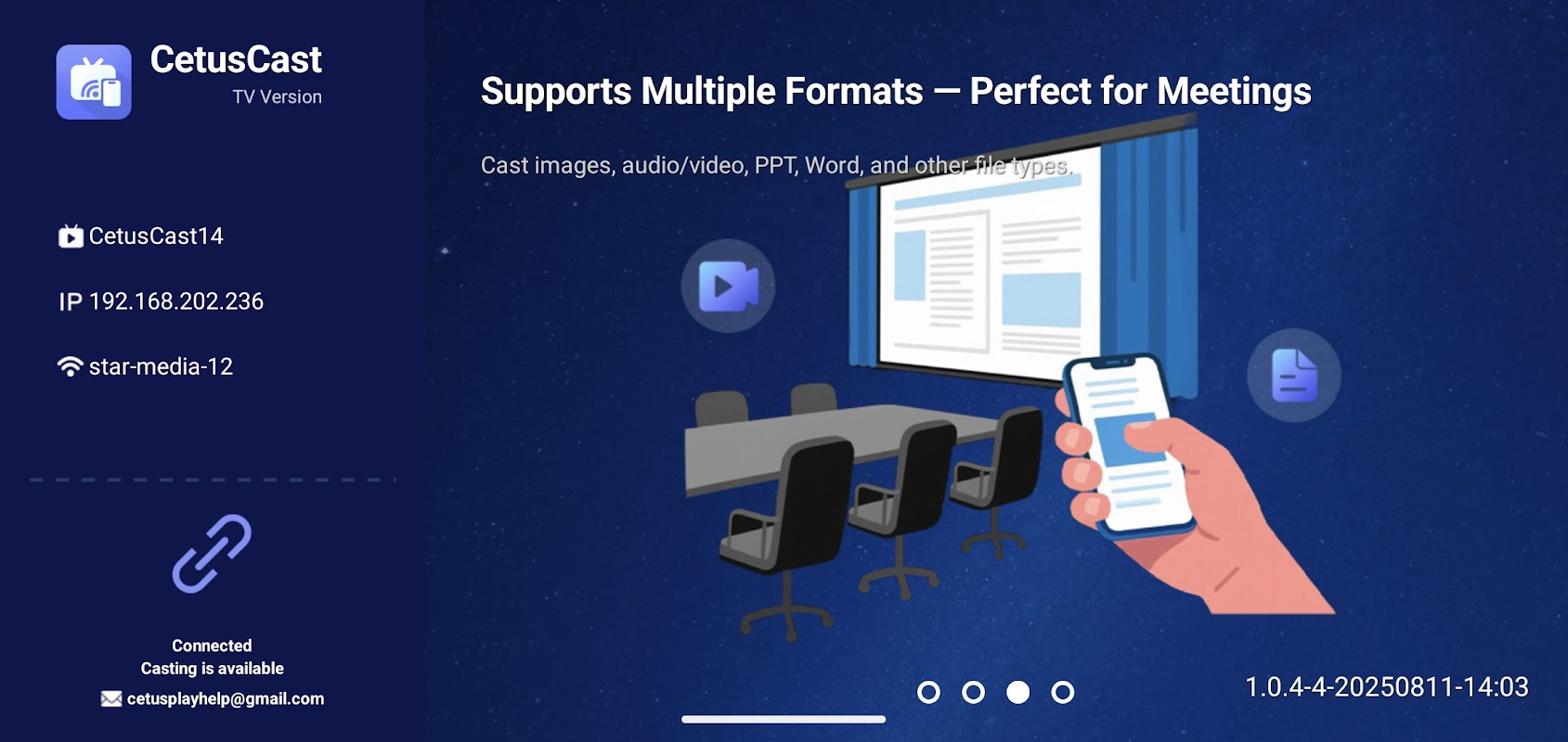 CetusCast TV 是一款功能强大且易于使用的投屏应用,专为 Android 电视和机顶盒设计。无论是家庭娱乐、商务会议还是课堂教学,CetusCast 都能让您在大屏幕上无缝分享您喜爱的内容。