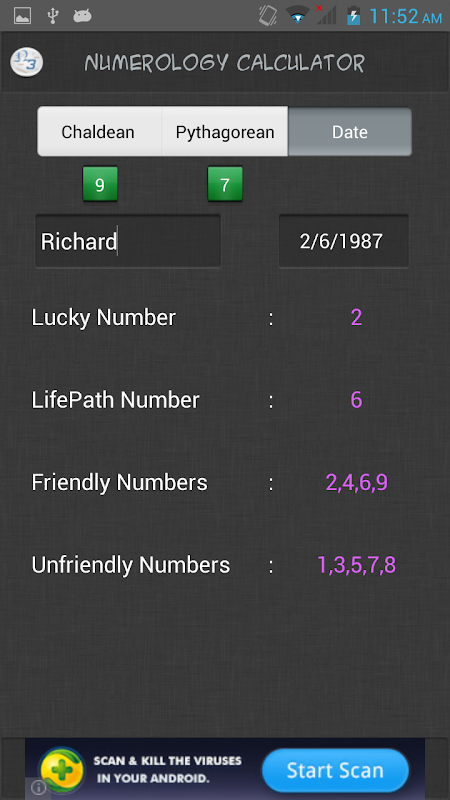 Here, you needs to give your name as input and in turns our app gives you the numerological number of the name entered. And, important feature is that you can get the number calculated for your name in both types by just switching between them.
