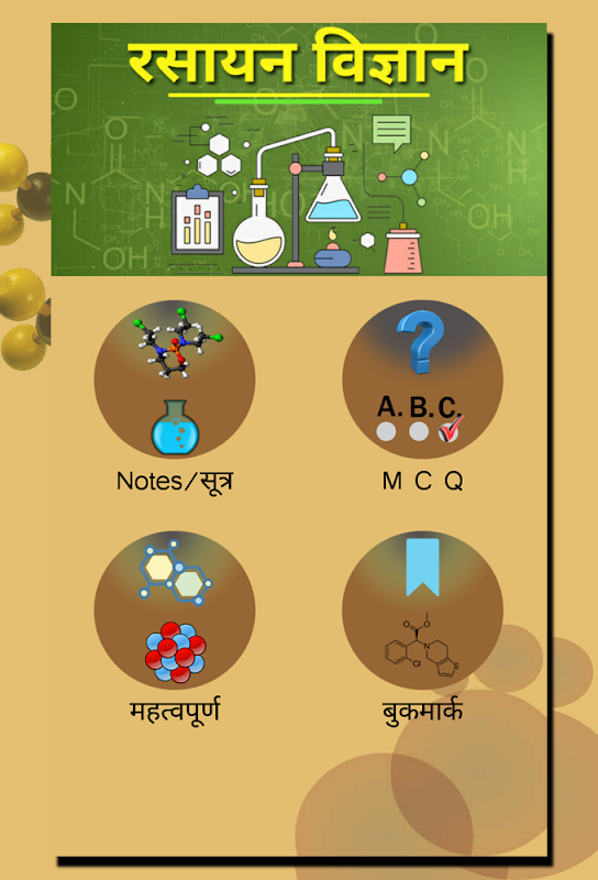印地语化学(रसायनविज्ञान)应用程序提供各种化学主题与Notes,MCQ和Formula,用于印地语的竞争和其他考试准备。