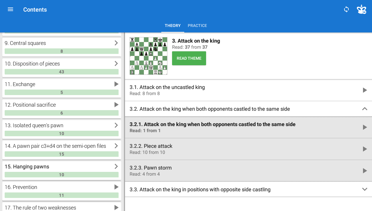 本程序还包含理论部分,根据实际例子说明比赛特定阶段的比赛方法。理论以互动方式提出,这意味着您不但可以阅读课程的文本,还可以在棋盘上走子并弄懂棋盘上的不清楚的走法。
