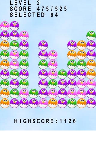 Cute chick puzzler for your Android device. Tap on chicks in groups of three or more to select. A selected group can be tapped again to release them. The larger the number of chicks the more points you score. When an entire column has been released more chicks will fill from the sides.