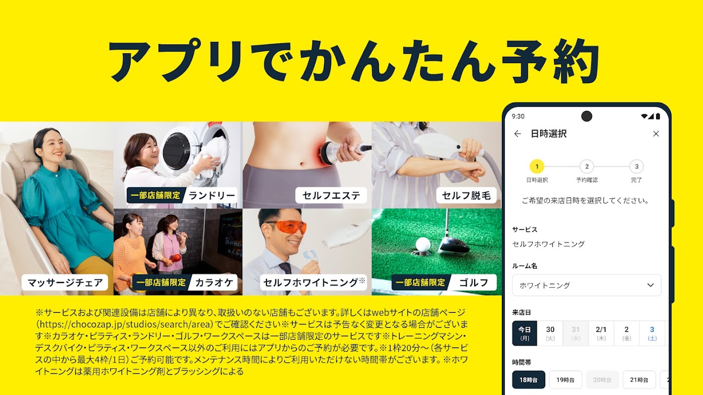 ※2 服务和相关设施因门店而异,部分门店可能不提供。详情请见官网店铺页面 ( https://chocozap.jp/studios/search/area )
