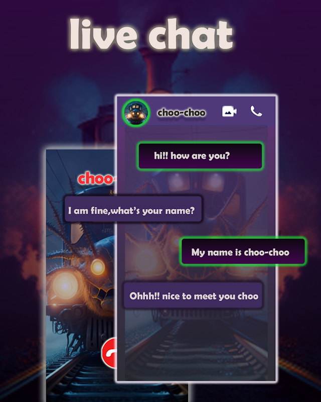 Choo choo Charles 假电话模拟器设置视频恶作剧电话,自定义计时器为 5 秒或更长时间。与可怕的怪物火车的视频假电话通过视频聊天进行交谈。 choo choo Charles monster scary train 是游戏的恐怖角色,通过语音恶作剧电话和视频聊天恶作剧您的朋友以获得乐趣。恶作剧电话模拟器设置怪物火车的假来电显示以享受这个假电话在线应用程序。