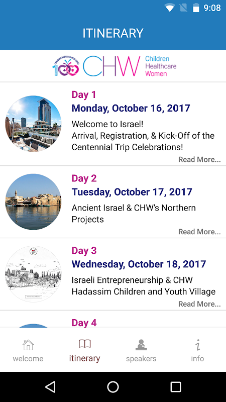 With the CHW Centennial Trip application you can easily access the program, helpful information, guest speaker's biographies, and receive real-time notifciations. Stay constantly connected through downloading the CHW Centennial Trip application!