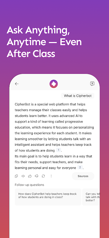 赛弗博特是一款由人工智能驱动的应用,帮助你充分利用课堂学习。只需提问,赛弗博特便会根据老师上传的课程资料,提供清晰准确的答案。就像随时随地与课程对话一样简单便捷。