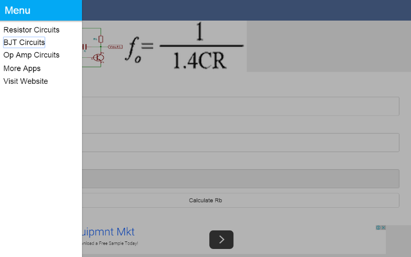 Among the electronics circuit calculators included are: bipolar junction transistor (BJT) astable oscillator, resistance of a material, op amp differential amplifier, etc.