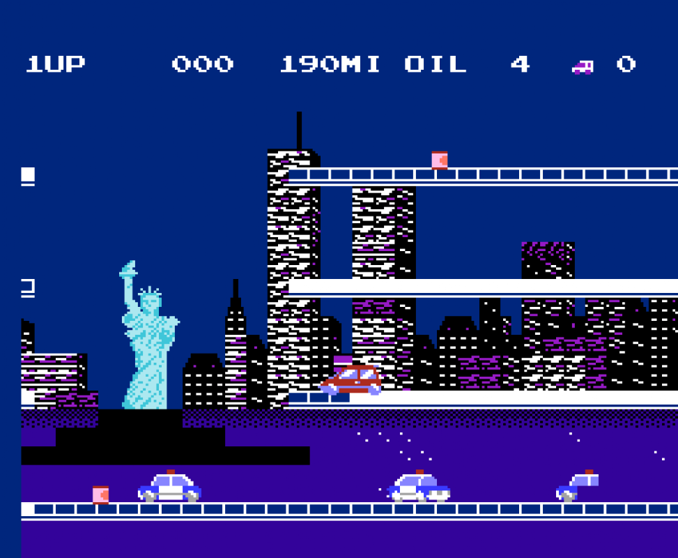 City Connection is a platform game in which the player controls a car that can never be stopped. It can only 180° handbrake turn or jump (normal jump or high jump). The object of the game is to drive through a series of cities, avoiding obstacles and painting every part of the roads. There are twelve locations: Manhattan, the Grand Canyon, Easter Island, Paris, Neuschwanstein Castle, London, Sydney, Egyptian temples, and cities in India, Holland, China and Japan.