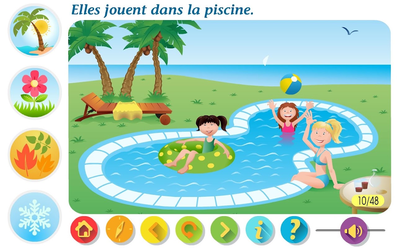 L'enfant doit établir la correspondance entre une situation illustrée et une saison. D’abord, l’enfant clique sur l'image pour afficher et entendre la phrase associée. Puis, quatre vignettes représentant les saisons apparaissent. En les survolant avec la souris, il entend le nom de la saison. Les huit derniers exercices sont des animations qui débutent en cliquant sur l'image. L’enfant doit alors sélectionner la saison adéquate et la glisser sur l'illustration. Si la réponse est bonne, un signal positif apparait. Sinon, il faut réessayer. Avec les flèches du bas, on passe à la prochaine image. Une animation supplémentaire apparaitra lorsque l’enfant aura réussi les quarante-huit associations.
