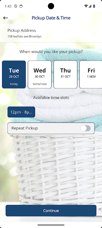 步骤 1:下载我们的应用程序,创建您个性化的 Bushwick Suds 自助洗衣店账户,即可开始使用。保存您的地址并指定您的专属清洁偏好。您可以根据自己的方便安排取件,无论是立即取件、稍后取件,还是安排门卫上门服务、使用专属送件员或使用我们的储物柜。
