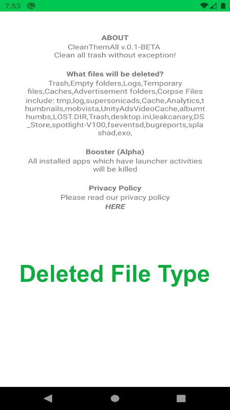 CleanThemAll is app cleaner to clean all trash on your android phone device storage without exception by removing safe to delete files. As cleaner app, CleanThemAll has simple UI to save app size keep small which easy to use..
