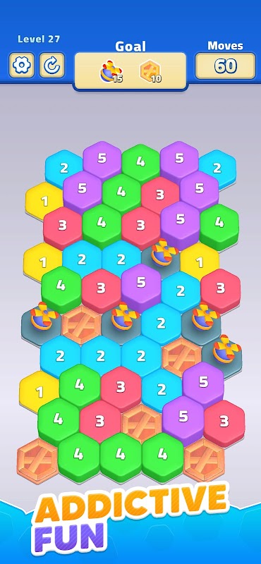 在 Click Up Hexa Stack 中合并、升级和爆破图块以清除目标!