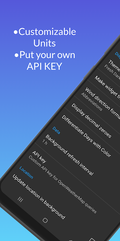 它是用户友好的,完全可定制的应用程序,可为用户提供6个主题的选项供您选择,此外,您甚至可以输入自己的天气API密钥。