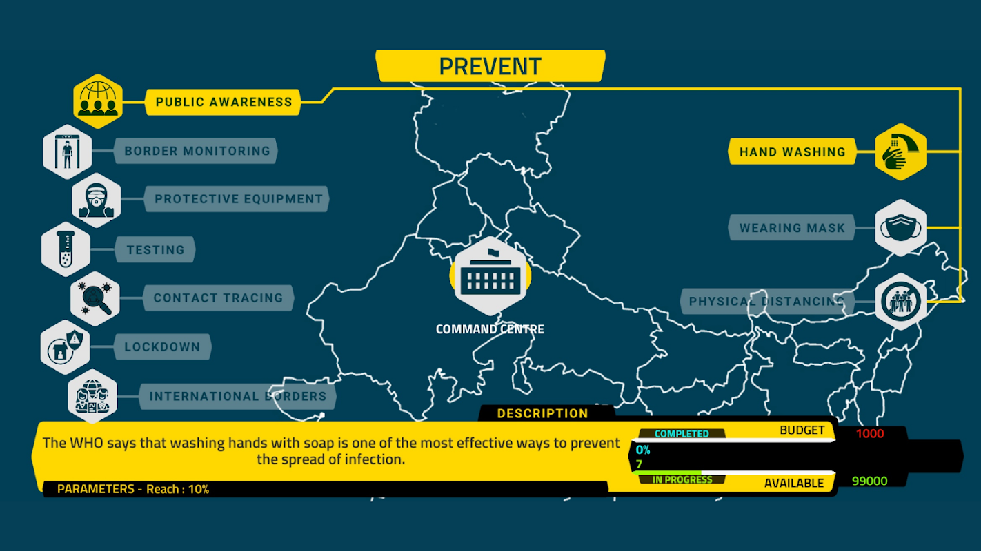 快进到2031年。人类正面临另一种威胁物种的大流行。经过多次突变,新型冠状病毒又回来感染我们,这一次,更具传染性和致命性。您的国家现在比以往任何时候都更需要您的领导。您会担任政府领导人吗?你会消灭致命的病毒吗?你的策略是什么?您会测试、追踪和治疗吗?你会为13亿人接种疫苗吗?您会实施严格的封锁吗?还是让病毒肆虐?