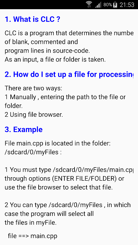 Code Line Counter (clc) is a program that determines the number of blank, commented and program lines in source-code. As an input, a file or folder is taken.