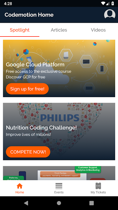 The app provides an access point to the Codemotion platform: you can read interesting articles, watch videos and learn from the professionals. You will also find the complete schedule for all the conferences and rate talks and speakers.