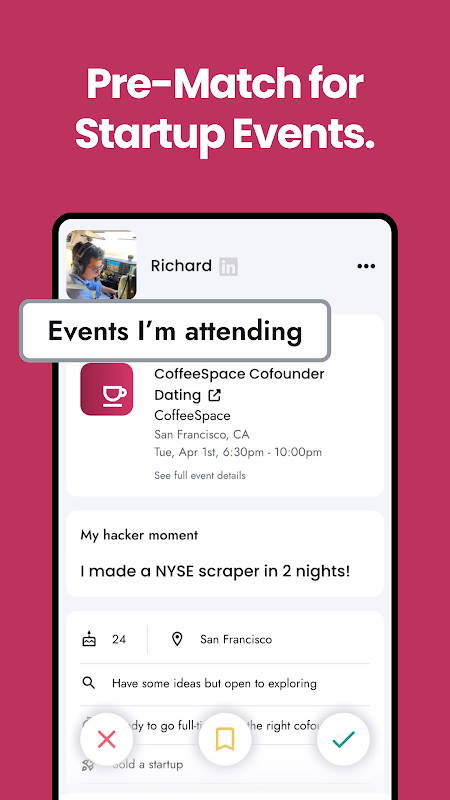 * 精细筛选:按技能、地点、投入程度、行业和角色进行搜索——无论您是在寻找联合创始人、创始工程师、设计师、运营人员,还是只是想找个一起探索想法的人。