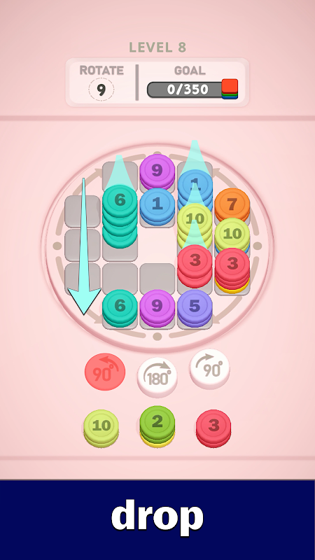 旋转面板以改变硬币堆的位置,这样上面的硬币堆就会掉下来。您的目标是在每个独特的拼图中对相同颜色和数字的硬币进行分类和堆叠,并收集分数以达到目标。当你堆叠 5 个或更多相同的硬币时,它们会合并成一个数字更大的硬币并获得积分。使用棋盘旋转来排序,堆叠相同颜色和数字的硬币,制定新策略。拖放提供给您的彩色硬币堆,以填充面板上的空单元格。当您通过关卡时,将解锁更具挑战性的谜题。