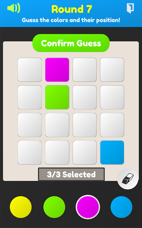 In this grid of squares you will need to memorize the colored squares and their position in the grid before the time runs out, where the grid will switch back to blank tiles. If you guess correctly, you will move on to the next round. If you fail your guess, the game is over.