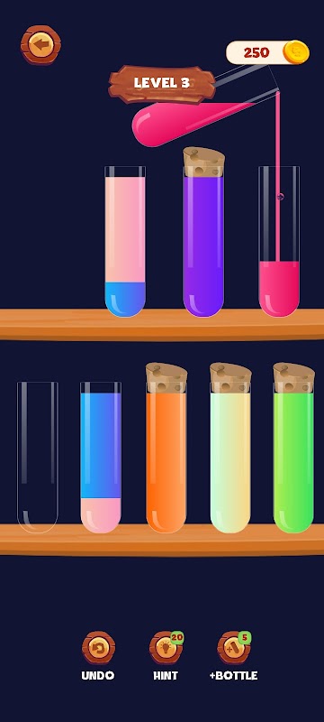 * 首先,您可以再次重新启动分类游戏级别,然后尝试再次完成无尽的瓶子填充挑战。您可以添加更多瓶子,使您的液体分类拼图变得容易。