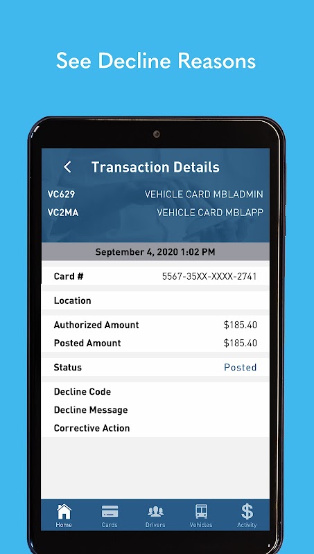 With the Comdata Fleet Manager mobile app, Fleets can manage their account, cards, drivers, vehicles, and more from the convenience of their mobile device - anytime, anywhere. View transactions, troubleshoot decline reasons, issue one-time product overrides, and much more.