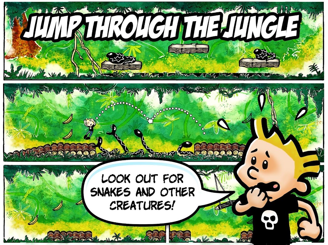 你不需要复杂的控制来玩漫画男孩。 点击可以让你的角色跳跃。 滑动以执行特殊动作,例如动力踩踏,甩尾,后空翻甚至飞行踢腿。 简单的控制使得漫画男孩很容易被任何人拾起。