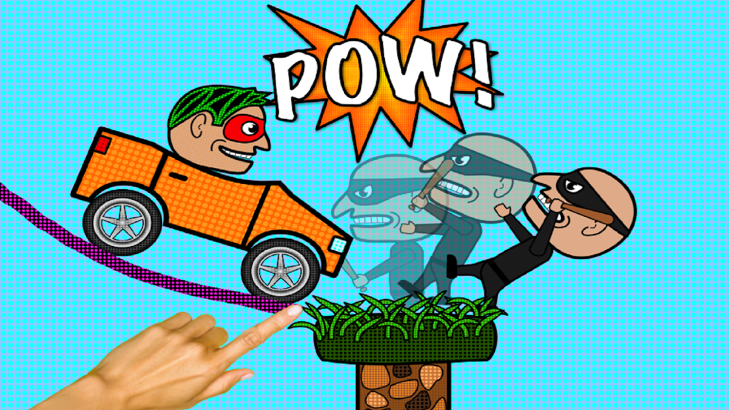 You draw the path as your car careens through colorful comic books! Blast the bad guys and send them barreling off the page into the unknown abyss. Keep an eye on your gas gauge making sure to refuel along the way. Collect coins as you play and earn bonus coins for completing levels. Use your coins to buy new characters, cars, colors, upgrade speed, and new comic strips. Don’t forget to watch out for stormy lightning clouds or you’ll get zapped!