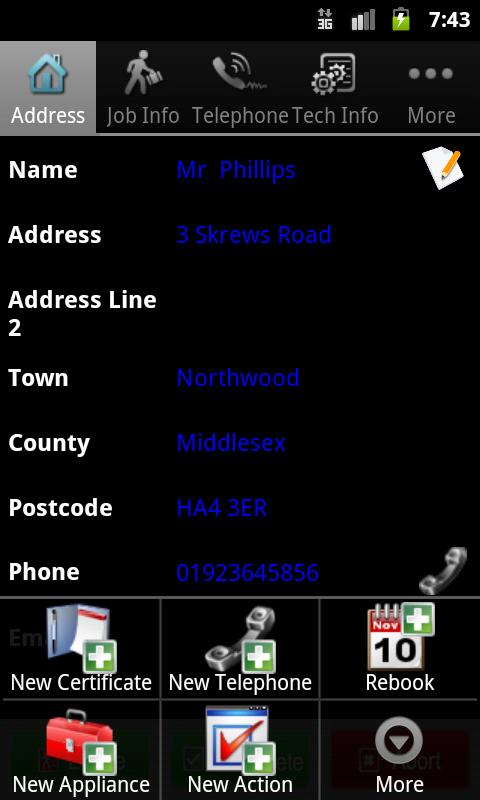 - Engineers can view job addresses, job information, customer telephone numbers, customer appliance details, notes and job history at the touch of a button,