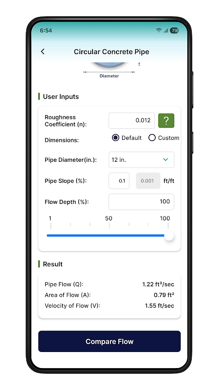 比较流量应用程序采用曼宁公式,这是评估无压污水管道水力容量最广泛接受的公式。