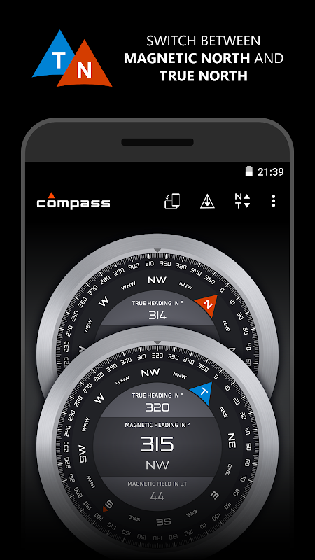 指南针是最精确和性能进行了优化指南针的应用程序。它显示所有基本点,例如N, NE, NNE, NE by N这指南针支持磁北和使用网络或GPS位置坐标,其可被复制的,共享和在地图浏览计算正北。