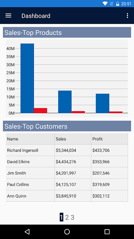 Experience the power of ComponentOne Studio for Xamarin UI controls and the ComponentOne Dashboard. It displays sales and profit comparison goals, top products, and customers. Primary controls include FlexChart, FlexPie, FlexGrid, BulletGraph, and CollectionView all built using Xamarin.Forms.