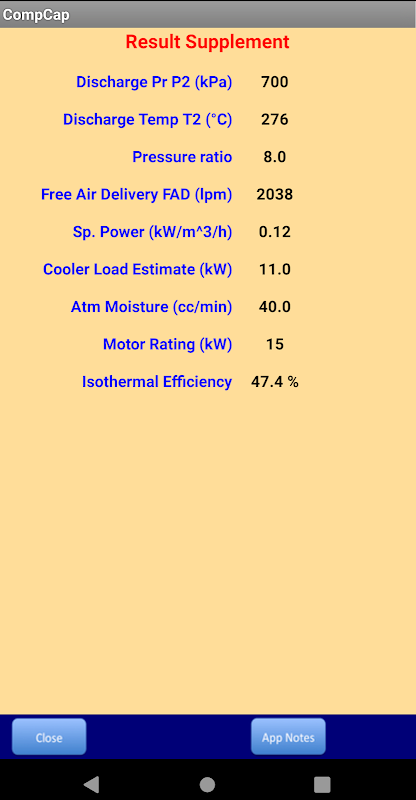 制造商给予一定的标准作业条件的的FAD,电力和其他效率压缩机的规格等数据。但是,压缩机的正常工作两个设定压力点之间,用于装载和卸载。因此,应用程序使用一个假设的平均排放压力环境压力比,计算出不同的性能指标。此外,任何在运行条件,例如,由于大气压力的高度,温度,湿度等的变化也可能对压缩机的性能有相当大的影响。一个典型的例子是显示在屏幕快照。因此,应用程序可以是一个有用的工具,不同的操作和维修人员不时压缩机性能评价。