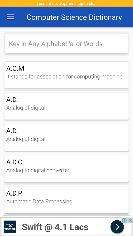 With more than 4000 Computer Terms and lots of pictorial representation of formulas, this Computer Science Dictionary defines all the technical terms from elementary to professional level. It’s not an ordinary Computer Dictionary, it contains History of Computer and many evolutions as a Timeline feature. This Computer Science Engineering App is full of numerous QUIZZES to brush up your knowledge and challenge your learning.