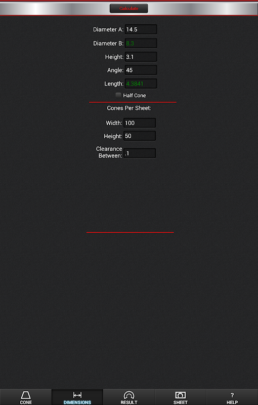 平坦图案尺寸的图纸生产。还计算锥可从片材尺寸被切割的数目。