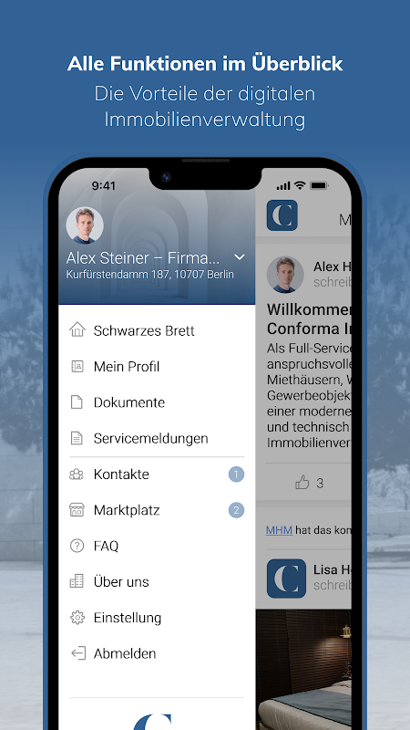 作为 CONFORMA Immobilien Management GmbH 的客户,您将受益于特别创新的客户服务,为您提供很大的自由度。借助 CONFORMA 应用程序,您可以使用智能手机全天候向我们报告问题和损坏,包括照片文档。我们还为您提供数字文件夹,其中包含您财产的重要文件。我们使用数字公告板通过推送消息主动提供有关委托给我们的财产的重要信息。