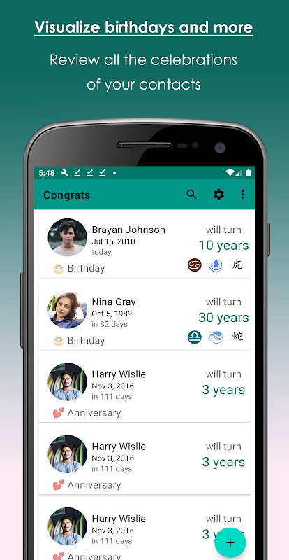 我们还为您提供有关您的联系人生日的有趣信息,您不会忘记人们的年龄,或者他们的星座。