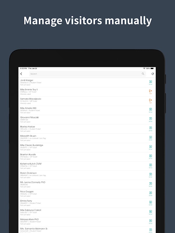 •入场控制:使用相机轻松扫描票证以进行验证。流畅的扫描进度允许非常快速的进入速度。或者,可以在不使用相机的情况下手动管理进入控制。
