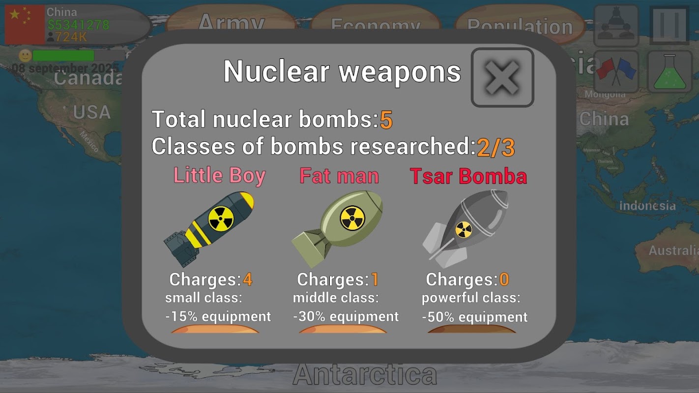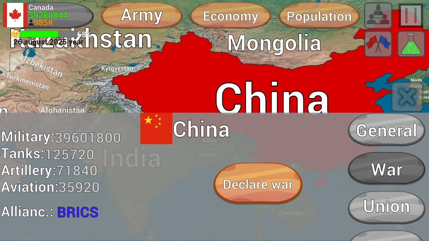 Conquer The World is a game about colonization and conquest of other countries. You can choose any country and improve its economy, buy upgrades for your army, research new methods of combat. Random events sometimes occur in the game that need to be resolved, the population of your country can call riots and rallies from which you need to defend yourself. You can also choose the ideology of your country, increase the growth of the country's population, change taxes and much more! The game is often updated and will not let you get bored