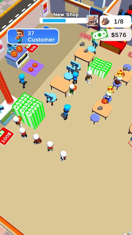 游戏中有多个商店,每个商店同时运营。这使您可以一次为多个客户提供服务并增加收入。