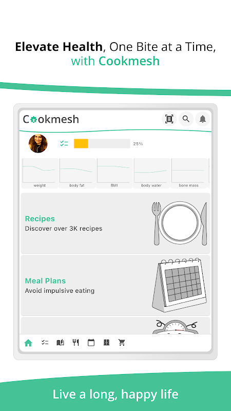 Cookmesh 应用程序是一个完整的健康生活组织者,可简化您走向更健康的旅程!我们的一体化应用程序可帮助您做出更健康的食物选择,实现您的营养目标,养成健康的习惯,预防或克服疾病,简化您的烹饪和膳食计划流程,并简化您的杂货购物。