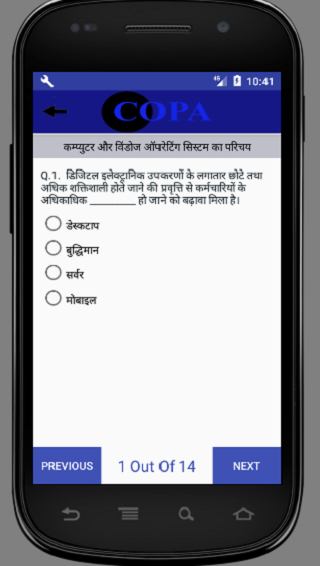 Computer Operator And Programming Assitant 2.0 App Contains Multiple Choice Question Based On Latest Syllabus In Hindi Language.The COPA ITI hindi app helps you for preaparing NCVT and SCVT Examination in ITIs.If you have any suggestions to improve the app you are most welcome
