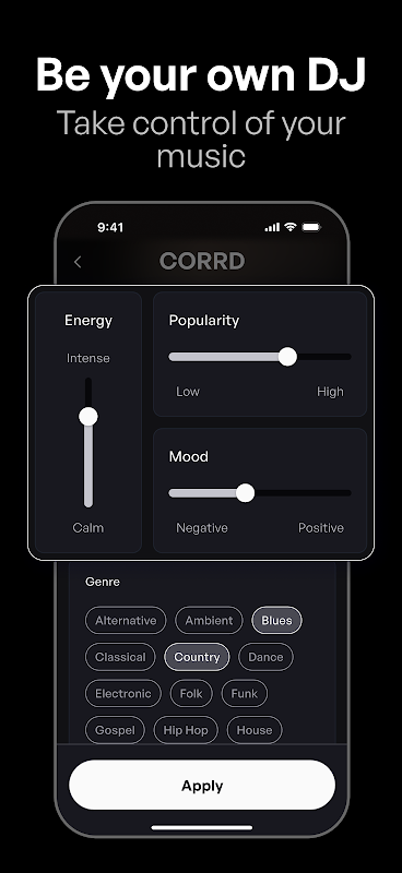 Studying, working out, or just relaxing? CORRD helps you discover new song list favorites instantly. Our engine adapts to your activity and taste, giving you control over how adventurous, mainstream, or underground your music library playlist is. It feels like a personal DJ evolving with you in real time.