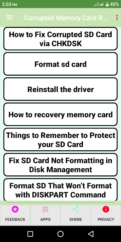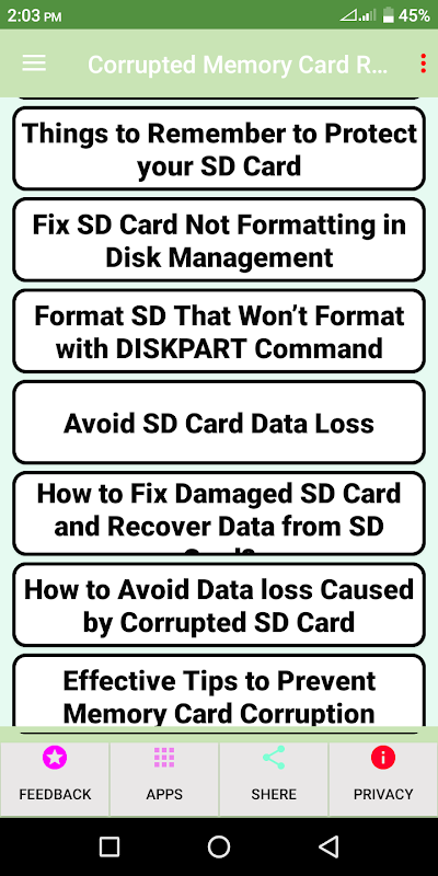 Corrupted Memory Card Repair Guide This app provides you with details on how to repair a memory card. From this app you can learn more about how to format a sd card.How to format a memory card by protecting data.You can get a sense of how the recovery memory card is.This app can easily solve any problems with memory card. Avoid SD Card Data Loss. It have simple methods to recover your damaged sd card. this apps advise and guide line for you SD Card and Repair Help tips.