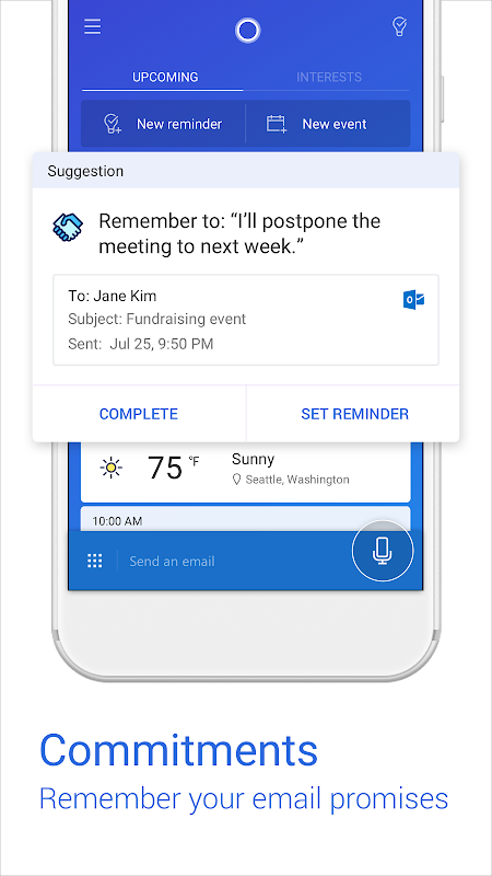 If you use Office 365 or Outlook.com, Cortana can automatically suggest reminders for the commitments you’ve made in email. So when you promise to do something by the end of the day, Cortana helps you make sure to complete your task.