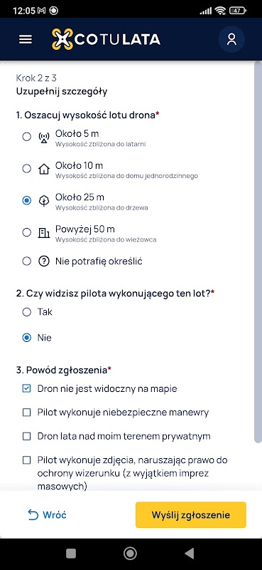如果在观察无人机飞行时,您有时想知道飞行员是否合法飞行 - 即他是否根据适用法规发出了适当的通知 - CoTuLata 应用程序正适合您。只需指示您的位置,确认您的位置后,您将能够查看您周围报告的无人机飞行的当前地图。提交的内容包括但不限于:有关位置、计划任务持续时间、最大飞行高度的信息。如果此类信息出现在 CoTuLata 地图上,则意味着飞行员已发出适当的通知,并且很可能已获得飞行授权。